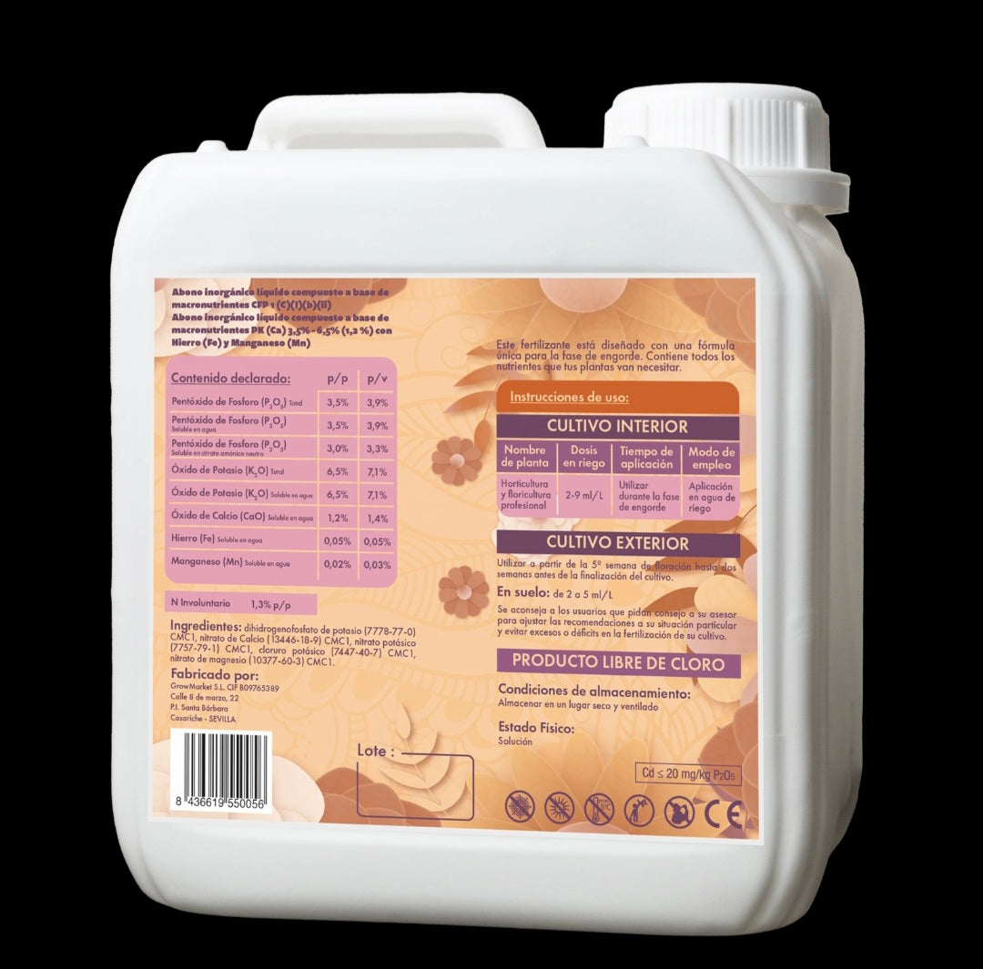 No necesitas añadir ningún otro Fertilizante al agua de riego, BULK de Pachamama contiene todos los MACRO y MICRO NUTRIENTES que las plantas van a necesitar a partir de la 5ª semana de Floración , incluido el Calcio y el Magnesio.